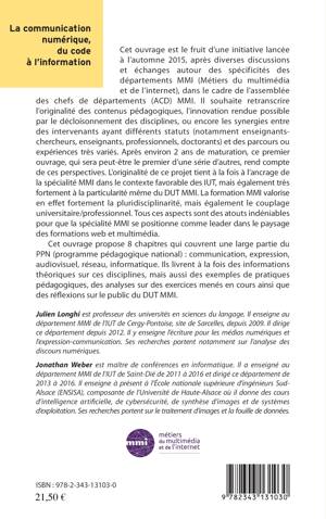 Cet ouvrage est le fruit d'une initiative autour des spécificités des départements MMI (Métiers du multimédia et de l'internet). Il souhaite retranscrire l'originalité des contenus pédagogiques, l'innovation rendue possible par le décloisonnement des disciplines ou encore les synergies entre les intervenants. Cet ouvrage couvre une large partie du Programme Pédagogique National (PPN) : communication, expertise audiovisuelle, réseau informatique, tant d'un point de vue théorique que pratique.