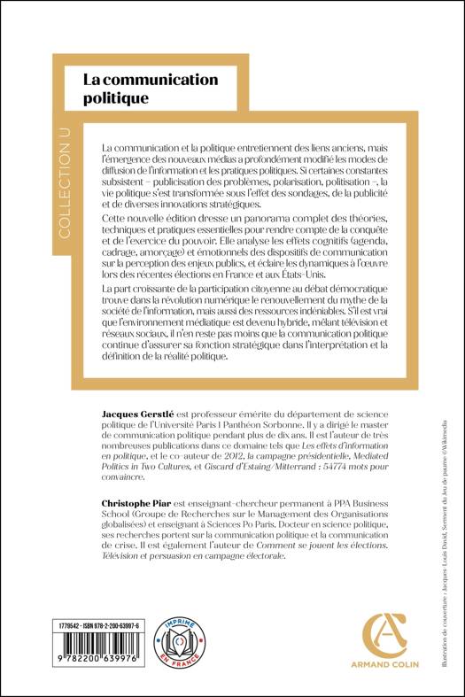 Communication et politique ont partie liée depuis toujours. Si la politique continueà présenter des dimensions immuables : publicisation des problèmes, polarisation sociale et politisation des règlements, la communication a, quant à elle, connu une véritable révolution à travers les médias qu’elle utilise pour diffuser l’information. La vie politique, elle aussi, s’est métamorphosée avec l’apparition des sondages d’opinion, de la publicité et de toute une série d’innovations (focus group, news management, triangulation, etc…) au service de stratégies politiques. La persuasion s’est technicisée, professionnalisée et a donné lieu à un encadrement juridique de nature à préserver son caractère démocratique dans certains pays. Cette nouvelle édition dresse un large panorama de cet ensemble disparate de théories, de techniques et de pratiques, qui se présente comme un outil désormais indispensable tant à la conquête qu’à l’exercice du pouvoir. Cet outil permet de générer des effets principalement cognitifs (agenda, cadrage, amorçage) et émotionnels liés au traitement de l’information et qui conditionnent l’emprise sur les perceptions politiques. L’analyse de ces effets éclairent les élections présidentielles françaises et américaines récentes. La part croissante de la participation citoyenne au débat démocratique trouve dans la révolution numérique le renouvellement du mythe de la société de l’information, mais aussi des ressources indéniables. Si l’environnement médiatique de la communication politique est désormais hybride mêlant télévision et réseaux sociaux, il n’en reste pas moins qu’elle garde sa fonction d’interprétation stratégique de la définition de la réalité politique.