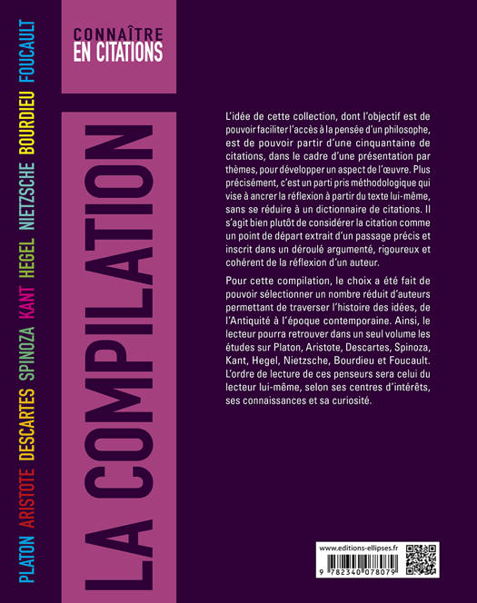 Pour cette compilation, le choix a été fait de pouvoir sélectionner un nombre réduit d’auteurs permettant de traverser l’histoire des idées, de l’antiquité à l’époque contemporaine. Ainsi, le lecteur pourra retrouver dans un seul volume les études sur Platon, Aristote, Descartes, Spinoza, Kant, Hegel, Nietzsche, Bourdieu et Foucault. L’ordre de lecture de ces penseurs sera celui du lecteur lui-même, selon ses centres d’intérêts, ses connaissances et sa curiosité.