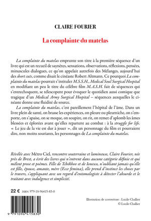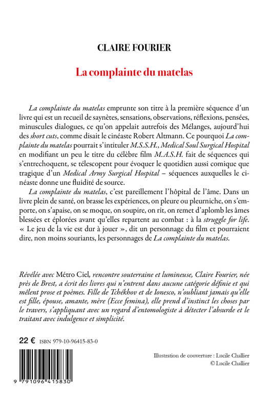 La complainte du matelas emprunte son titre à la première séquence d’un livre qui est un recueil de saynètes, sensations, observations, réflexions, pensées, minuscules dialogues, ce qu’on appelait autrefois des Mélanges, aujourd’hui des short cuts, comme disait le cinéaste Robert Altmann. Ce pourquoi La complainte du matelas pourrait s’intituler M.S.S.H., Médical Soul Surgical Hospital en modifiant un peu le titre du célèbre film M.A.S.H. fait de séquences qui s'entrechoquent, se télescopent pour évoquer le quotidien aussi comique que tragique d'un Médical Army Surgical Hospital – séquences auxquelles le cinéaste donne une fluidité de source. La complainte du matelas, c’est pareillement l’hôpital de l’âme. Dans un livre plein de santé, on brasse les expériences, on pleure ou pleurniche, on s’emporte, on s’apaise, on se moque, on soupire, on rit, on remet d’aplomb les âmes blessées et éplorées avant qu’elles repartent au combat : à la struggle for life. « Le jeu de la vie est dur à jouer », dit un personnage du film et pourraient dire, non moins souriants, les personnages de La complainte du matelas.