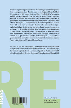 Peut-on se préoccuper de la Terre et des ravages de l'Anthropocène tout en empruntant un cheminement cosmologique ? Pour Frédéric Neyrat, cela ne fait aucun doute : réduire l'écologie à la Terre, c'est oublier que cette dernière est une planète parmi d'autres planètes, exposée au soleil et aux astéroïdes. Avec La Condition planétaire, le philosophe propose une nouvelle voie pour penser l'écologie, la vie et la technologie. La compréhension de l'interdépendance entre la Terre et le cosmos est une manière d'explorer les contours d'un régime épistémologique à réinventer, qui ne se limite pas uniquement au terrestre, et de toucher ainsi du doigt une utopie transformatrice. S'appuyant sur l'astrophysique, l'astrobiologie et les cosmologies non occidentales, cet ouvrage essentiel est un appel à une prise de conscience planétaire. Quête métaphysique, La Condition planétaire nous invite à repenser notre humanité : notre existence sur Terre est toujours reliée à un ailleurs céleste.