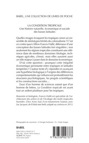 Dans cet ardent plaidoyer pour les Tropiques, Francis Hallé ouvre une discussion aussi documentée qu'engagée sur la "condition tropicale", à partir de données naturelles, économiques et sociales sans lesquelles toute compréhension globale de notre monde est impossible, et vain tout espoir de voir se réduire les inégalités à l'échelle de la planète.