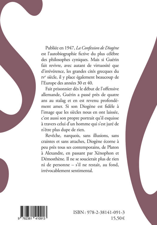 Fait prisonnier dès le début de l’offensive allemande, Guérin a passé près de quatre ans au stalag et en est revenu profondément amer. Si son Diogène est fidèle à l’image que les siècles nous en ont laissée, c’est aussi son propre portrait qu’il esquisse à travers celui d’un homme qui s’est juré de n’être plus dupe de rien.