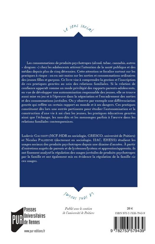 Les consommations de produits psychotropes (alcool, tabac, cannabis, autres "drogues") chez les adolescents attirent l'attention de la santé publique et des médias depuis plus de cinq décennies. Cette attention se focalise surtout sur les pratiques à risque : on en sait moins sur les sorties et consommations ordinaires des jeunes filles et garçons. Ce livre vise à comprendre la gestion et l'inscription de ces pratiques genrées au sein des relations familiales. Si la relation de confiance apparaît comme un mode privilégié des rapports parents-adolescents, en vue de développer une autonomisation responsable des jeunes, elle se trouve aussi mise en jeu et à l'épreuve dans la négociation et l'encadrement des sorties et des consommations juvéniles. On y observe par exemple une différenciation genrée qui reflète un certain rapport au monde et à ses dangers. Ces pratiques constituent dès lors une entrée pertinente pour étudier l'autonomisation et la construction d'une vie à soi chez les jeunes, les pratiques éducatives genrées ainsi que l'échange, les non-dits et les mensonges parfois à l'oeuvre dans les relations familiales contemporaines.