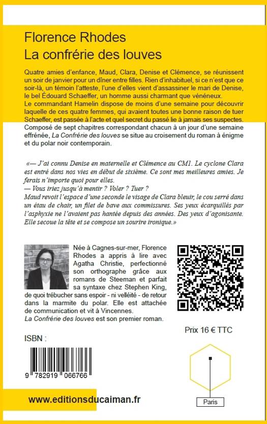 Quatre amies d'enfance aux personnalités très différentes, Maud, Clara, Denise et Clémence, se réunissent un soir de janvier pour un dîner entre filles. Rien d'inhabituel, si ce n'est que ce soir-là, un témoin l'atteste, l'une d'elles vient d'assassiner le mari de Denise, le bel Edouard Schaeffer, un homme aussi charmant que vénéneux. Au moment où ses propres squelettes sont délogés de leur placard, le commandant Hamelin dispose de moins d'une semaine pour découvrir laquelle de ces quatre femmes, qui avaient toutes une bonne raison de tuer Schaeffer, est passée à l'acte et quel secret du passé lie à jamais ses suspectes. Composé de sept chapitres correspondant chacun à un jour d'une semaine effrénée, La Confrérie des louves se situe au croisement du roman à énigme et du polar noir contemporain.