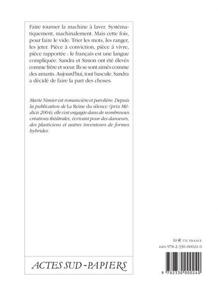 Faire tourner la machine à laver. Systématiquement, machinalement. Mais cette fois, pour faire le vide. Trier les mots, les ranger, les jeter. Pièce à conviction, pièce à vivre, pièce rapportée : le français est une langue compliquée. Sandra et Simon ont été élevés comme frère et soeur. Ils se sont aimés comme des amants. Aujourd'hui, tout bascule. Sandra a décidé de faire la part des choses.
