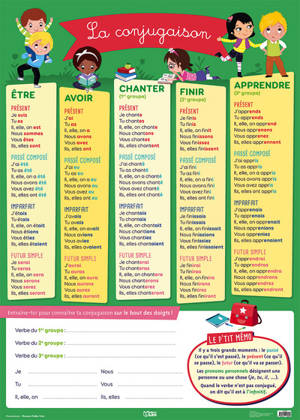 Ce poster met en avant les verbes être et avoir ainsi qu'un verbe de chaque groupe aux quatre temps de l'indicatif. Une partie permet à l'enfant de s'entraîner à écrire. Un mémo rappelle des définitions grammaticales essentielles dans l'apprentissage de la conjugaison.