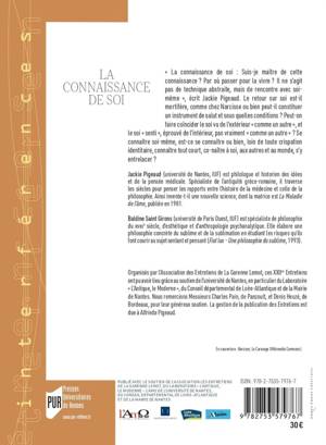 « La connaissance de soi : Suis-je maître de cette connaissance ? Par où passer pour la vivre ? Il ne s’agit pas de technique abstraite, mais de rencontre avec soi-même », écrit Jackie Pigeaud. Le retour sur soi est-il mortifère, comme chez Narcisse ou bien peut-il constituer un instrument de salut et sous quelles conditions ? Peut-on faire coïncider le soi vu de l’extérieur « comme un autre », et le soi « senti », éprouvé de l’intérieur, pas vraiment « comme un autre » ? Se connaître soi-même, est-ce se connaître ou bien, loin de toute crispation identitaire, connaître tout court, co-naître à soi, aux autres et au monde, s’y entrelacer ?