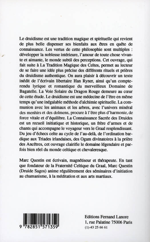 Cet ouvrage, qui fait suite à La Tradition Magique des Celtes, permet au lecteur de se faire une idée plus précise des différents rituels et prières du druidisme authentique. On aura plaisir à découvrir un texte inédit de l'écrivain libertaire Han Ryner, ainsi qu'un compte-rendu lyrique et romantique du merveilleux Domaine de Bagatelle. La Voie Solaire du Dragon Rouge demeure au coeur de cette étude. Le druidisme est une médecine de l'être en même temps qu'une inégalable méthode d'alchimie spirituelle. La communion avec les animaux et les arbres, avec l'univers minéral des menhirs et des dolmens, procure à l'être plus d'harmonie, de force vitale et d'équilibre. La Connaissance Sacrée des Druides est un recueil initiatique et historique, un frère d'armes et de chants qui accompagne le voyageur vers le Graal resplendissant. Du jeu d'échecs celte au cycle de l'au-delà, de l'ordination bardique aux Triades irlandaises, des Ogam divinatoires à la prière des Ancêtres, cet ouvrage clarifie le domaine légendaire et parfois bien réel du monde celtique et chevaleresque.