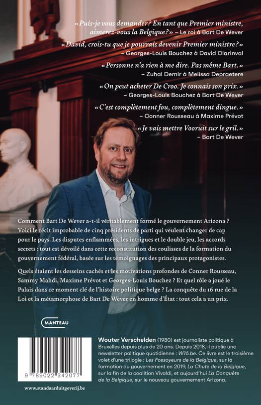 Comment Bart De Wever a-t-il véritablement formé le gouvernement Arizona? Voici le récit improbable de cinq présidents de parti qui veulent changer de cap pour le pays. Les disputes enflammées, les intrigues et le double jeu, les accords secrets : tout est dévoilé dans cette reconstitution des coulisses de la formation du gouvernement fédéral, basée sur les témoignages des principaux protagonistes.Quels étaient les desseins cachés et les motivations profondes de Conner Rousseau, Sammy Mahdi, Maxime Prévot et Georges-Louis Bouchez ? Et quel rôle a joué le Palais dans ce moment clé de l'histoire politique belge ? La conquête du 16 rue de la Loi et la métamorphose de Bart De Wever en homme d'état : tout cela a un prix.