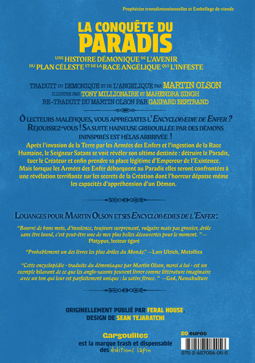 Malveillants lecteurs, réjouissez-vous ! Vous vous êtes délectés de l'Encyclopédie de l'enfer, sachez que la détestable suite, rédigée de la griffe même de Satan, est arrivée ! Après que l'armée des Enfers ait conquis la misérable planète Terre et se soit repue de la race humaine lors d'un festin de célébration, le Seigneur Satan révèle son intention d'explorer jusqu'aux plus lointains confins de l'univers pour dénicher le trône du méprisable Créateur. Son plan est de renverser Dieu et de prendre la place qui lui revient en tant que Empereur de l'Existence. Cependant, des complications infernales surviennent rapidement... Et lorsque les armées des Enfers débarquent pour conquérir le Paradis, elles tombent sur un secret troublant tapi au coeur de la Création, un secret bien difficile à avaler, même pour un démon.