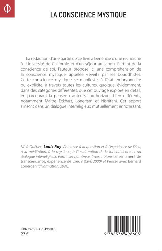 La rédaction d'une partie de ce livre a bénéficié d'une recherche à l'Université de Californie et d'un séjour au Japon. Partant de la conscience de soi, l'auteur propose ici une compréhension de la conscience mystique, appelée éveil par les bouddhistes. Cette conscience mystique se manifeste, à l'état embryonnaire ou explicite, à travers toutes les cultures, quoique, évidemment, dans des catégories différentes, que cet ouvrage explore en détail, en parcourant la pensée d'auteurs aux horizons bien différents, notamment Maître Eckhart, Lonergan et Nishitani. Cet apport s'inscrit dans un dialogue interreligieux mutuellement enrichissant.