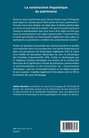 Qu'est-ce que le patrimoine pour chacun d'entre nous ? N'importe quel objet du monde peut-il en faire partie ? En quoi et surtout comment change la représentation que nous avons d'un objet une fois que nous lui reconnaissons une valeur patrimoniale ? Toutes ces questions transversales aux sciences humaines et sociales sont explorées dans cet ouvrage. L'auteure développe une analyse de la construction discursive de la signification lexicale de patrimoine, patrimonialiser et patrimonialisation et des mécanismes de « contamination sémantique » que leur convocation produit sur les objets auxquels ils sont associés.
