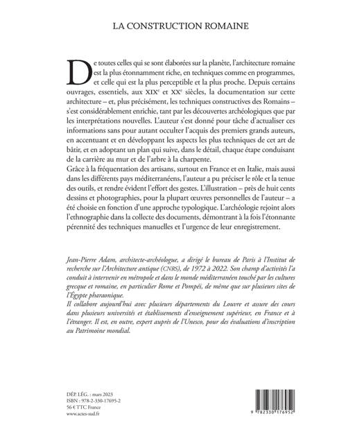 De toutes celles qui se sont élaborées sur la planète, l'architecture romaine est la plus étonnamment riche, en techniques comme en programmes, et celle qui est la plus perceptible et la plus proche. Depuis certains ouvrages, essentiels, aux XIXe et XXe siècles, la documentation sur cette architecture - et, plus précisément, les techniques constructives des Romains - s'est considérablement enrichie, tant par les découvertes archéologiques que par les interprétations nouvelles. L'auteur s'est donné pour tâche d'actualiser ces informations sans pour autant occulter l'acquis des premiers grands auteurs, en accentuant et en développant les aspects les plus techniques de cet art de bâtir, et en adoptant un plan qui suive, dans le détail, chaque étape conduisant de la carrière au mur et de l'arbre à la charpente. Grâce à la fréquentation des artisans, surtout en France et en Italie, mais aussi dans les différents pays méditerranéens, l'auteur a pu préciser le rôle et la tenue des outils, et rendre évident l'effort des gestes. L'illustration - près de huit cents dessins et photographies, pour la plupart oeuvres personnelles de l'auteur - a été choisie en fonction d'une approche typologique. L'archéologie rejoint alors l'ethnographie dans la collecte des documents, démontrant à la fois l'étonnante pérennité des techniques manuelles et l'urgence de leur enregistrement.