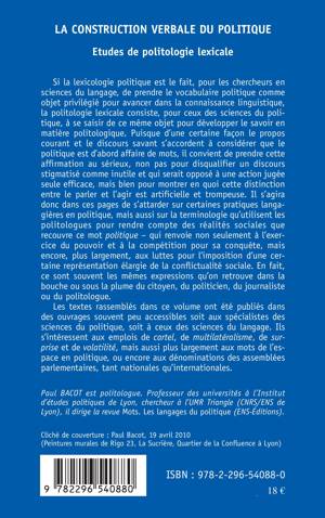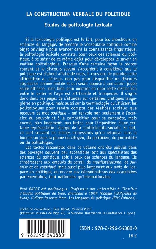 Si la lexicologie politique est le fait, pour les chercheurs en sciences du langage, de prendre le vocabulaire politique comme objet privilégié pour avancer dans la connaissance linguistique, la politologie lexicale consiste, pour ceux des sciences du politique, à se saisir de ce même objet pour développer le savoir en matière politologique. Il s'agit donc de s'attarder dans ces pages sur certaines pratiques langagières en politique, mais aussi sur la terminologie qu'utilisent les politologues pour rendre compte des réalités sociales que recouvre ce mot politique.