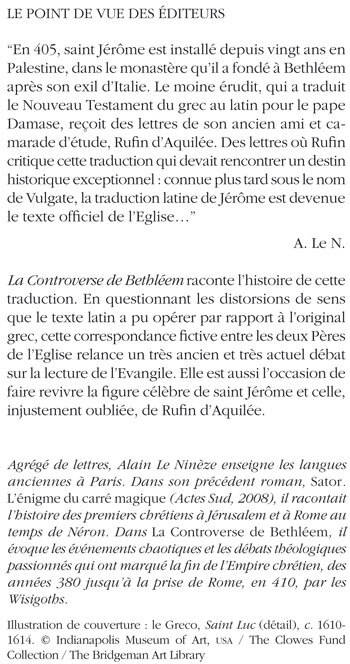 «Agrégé de lettres, Alain Le Ninèze enseigne les langues anciennes à Paris. Dans son précédent roman, »Sator. L'énigme du carré magique« (Actes Sud, 2008), il racontait l'histoire des premiers chrétiens à Jérusalem et à Rome au temps de Néron. Dans »La Controverse de Bethléem«, il évoque les événements chaotiques et les débats théologiques passionnés qui ont marqué la fin de l'Empire chrétien, des années 380 jusqu'à la prise de Rome, en 410, par les Wisigoths.»