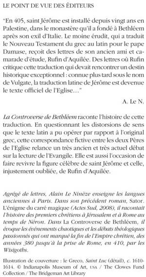 La Controverse de Bethléem raconte l'histoire de cette traduction. En questionnant les distorsions de sens que le texte latin a pu opérer par rapport à l'original grec, cette correspondance fictive entre les deux Pères de l'Eglise relance un très ancien et très actuel débat sur la lecture de l'Evangile. Elle est aussi l'occasion de faire revivre la figure célèbre de saint Jérôme et celle, injustement oubliée, de Rufin d'Aquilée.