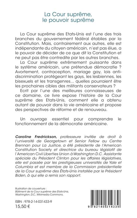 La Cour suprême des Etats-Unis est l'une des trois branches du gouvernement fédéral établies par la Constitution. Mais, contrairement aux autres, elle est indépendante du citoyen américain, n'est pas élue, a le pouvoir de décider de ce que dit la Constitution et ne peut pas être contredite par les autres branches. La Cour suprême extrêmement puissante dans le système américain, une prétendue démocratie ? Avortement, contraception, mariage gay, lois anti-discrimination protégeant les gays, les lesbiennes, les bisexuels et les transgenres... quelles pourraient être les prochaines cibles des militants conservateurs ? Ecrit par l'une des meilleures connaisseuses de ce domaine, ce livre expose l'histoire de la Cour suprême des Etats-Unis, comment elle a obtenu autant de pouvoir dans la vie américaine et propose des perspectives de réforme et de renouveau. Un ouvrage essentiel pour comprendre le fonctionnement de la démocratie américaine.