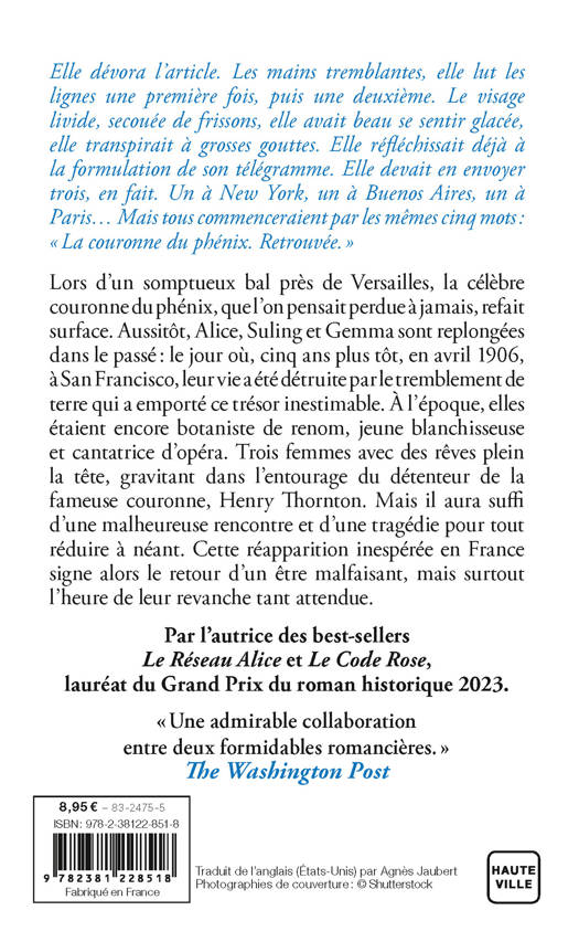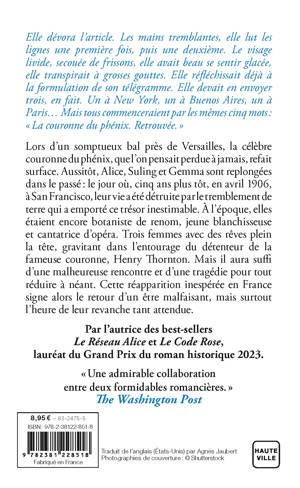 Lors d'un somptueux bal près de Versailles, la célèbre couronne du phénix, que l'on pensait perdue à jamais, refait surface. Aussitôt, Alice, Suling et Gemma sont replongées dans le passé : le jour où, cinq ans plus tôt, en avril 1906, à San Francisco, leur vie a été détruite par le tremblement de terre qui a emporté ce trésor inestimable. À l'époque, elles étaient encore botaniste de renom, jeune blanchisseuse et cantatrice d'opéra. Trois femmes avec des rêves plein la tête, gravitant dans l'entourage du détenteur de la fameuse couronne, Henry Thornton. Mais il aura suffi d'une malheureuse rencontre et d'une tragédie pour tout réduire à néant. Cette réapparition inespérée en France signe alors le retour d'un être malfaisant, mais surtout l'heure de leur revanche tant attendue.