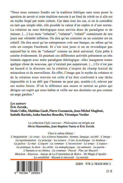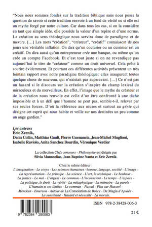« Nous nous sommes fondés sur la tradition biblique sans nous poser la question de savoir si cette tradition renvoie à un fond de vérité ou si elle est un mythe forgé par notre culture. Car dans tous les cas, si on la considère en tant que simple idée, elle possède la valeur d'un repère et d'une norme. La création au sens théologique nous servira donc de paradigme et de mesure. [...] Les mots « création », « créateur », « créatif' connaissent de nos jours une véritable inflation. On dira qu'un couturier ou un cuisinier est un créatif. On dira aussi qu'un entrepreneur crée une banque, ou même qu'on crée un compte Facebook. Et c'est tout juste si on ne revendique pas aujourd'hui le titre de « créateur » comme un droit universel. Cela prête à sourire évidemment. Et pourtant ces différentes activités présentent un très lointain rapport avec notre paradigme théologique : elles inaugurent toutes quelque chose de nouveau, qui n'existait pas auparavant. [...] Ce n'est pas un hasard si le discours sur la création s'inspire du champ lexical du miraculeux et du merveilleux. En effet, l'image que le mythe du créateur et de la création nous renvoie est celle d'un être confronté à une tâche impossible et à un défi que l'homme ne peut pas, semble-t-il, relever par ses seules forces. D'où la référence aux muses et surtout au génie qui désigne cet esprit qui nous habite et veille sur nos destinées un peu comme un ange gardien. »