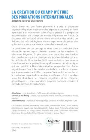 Gildas Simon est une figure pionnière. Il a créé le laboratoire Migrinter (Migrations internationales, espaces et sociétés) en 1985, a participé à un mouvement collectif qui a présidé à la progressive autonomisation du champ des études migratoires en France. Ce processus s'est structuré autour d'une circulation des savoirs, des théories, des méthodologies et des concepts entre disciplines ainsi qu'entre institutions aux niveaux national et international. Cet ouvrage poursuit ce cheminement en approfondissant quelques-unes des dynamiques qui ont présidé à l'institutionnalisation progressive des études migratoires en France. Les articles réunis dans ce volume montrent que le processus est articulé et complexe. Sans vouloir rechercher un fil conducteur capable de rassembler les différents récits - variables selon les disciplines, les histoires migratoires et les contextes géopolitiques -, les contributeurs souhaitent proposer quelques réflexions à partir du parcours de Gildas Simon.
