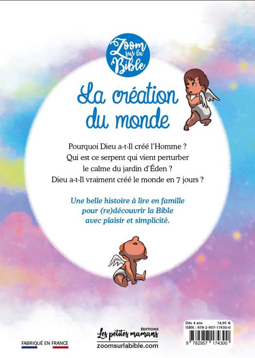 Zoom sur la Bible, c’est LA série qui raconte la Bible aux 5-10 ans. Voilà une vraie innovation dans la littérature jeunesse : des albums qui associent avec brio la modernité du format « série » et le respect du récit biblique. Une série pour lire la Bible…sans en avoir l’air ! Avec ce premier épisode, Zoom et Zoum (les mascottes de la collection) nous font partager l’aventure de la création du monde. De belles illustrations, des histoires qui font grandir et même du suspens... Pourquoi Dieu a-t-Il créé l’Homme ? Qui est ce serpent qui vient perturber le calme du jardin d’Eden ? Dieu a-t-il vraiment créé le monde en 7 jours ?