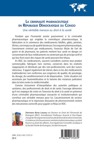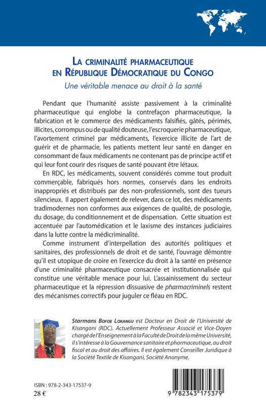 Pendant que l'humanité assiste passivement à la criminalité pharmaceutique qui englobe la contrefaçon pharmaceutique, la fabrication et le commerce des médicaments falsifiés, gâtés, périmés, illicites ou de qualité douteuse, les patients mettent leur santé en danger. Comme instrument d'interpellation des autorités politiques et sanitaires, des professionnels de droit et de santé, l'ouvrage démontre qu'il est utopique de croire en l'exercice du droit à la santé en présence d'une criminalité pharmaceutique consacrée et institutionnalisée qui constitue une véritable menace pour lui. L'assainissement du secteur pharmaceutique et la répression dissuasive de pharmacriminels restent des mécanismes correctifs pour juguler ce fléau en RDC.