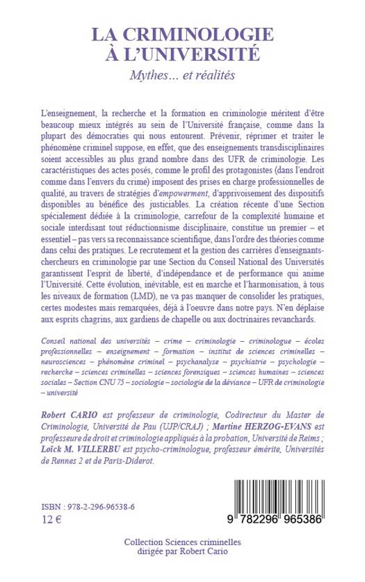 L'enseignement, la recherche et la formation en criminologie méritent d'être beaucoup mieux intégrés au sein de l'Université française. Prévenir, réprimer et traiter le phénomène criminel suppose, que des enseignements transdisciplinaires soient accessibles au plus grand nombre dans des UFR de criminologie. Cet opuscule permet d'offrir à tous une analyse concrète de la situation.