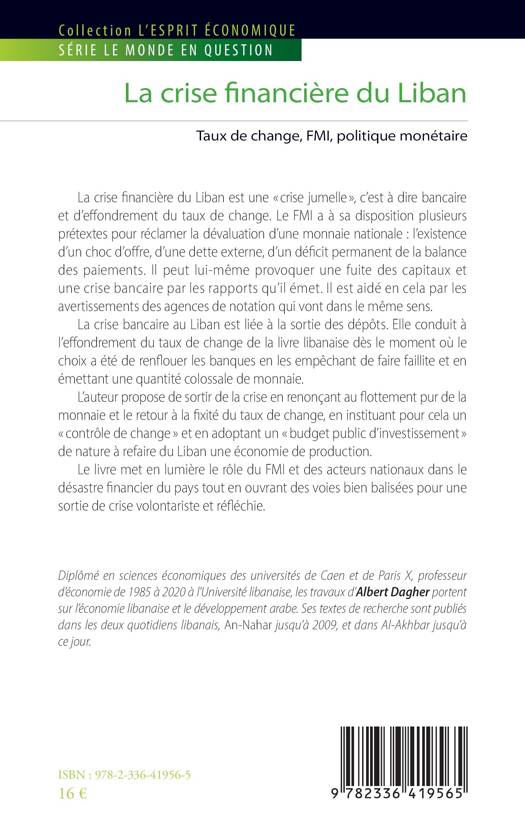 La crise financière du Liban est une crise jumelle, c'est-à-dire bancaire et d'effondrement du taux de change. Le FMI a à sa disposition plusieurs prétextes pour réclamer la dévaluation d'une monnaie nationale: l'existence d'un choc d'offre, d'une dette externe, d'un déficit permanent de la balance des paiements. Il peut lui-même provoquer une fuite des capitaux et une crise bancaire par les rapports qu'il émet. Il est aidé en cela par les avertissements des agences de notation qui vont dans le même sens. La crise bancaire au Liban est liée à la sortie des dépôts. Elle conduit à l'effondrement du taux de change de la livre libanaise dès le moment où le choix a été de renflouer les banques en les empêchant de faire faillite et en émettant une quantité colossale de monnaie. L'auteur propose de sortir de la crise en renonçant au flottement pur de la monnaie et le retour à la fixité du taux de change, en instituant un contrôle de change et un budget public d'investissement .