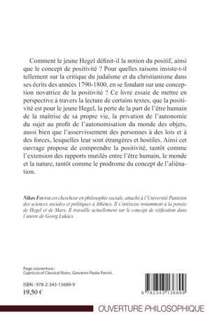 Comment le jeune Hegel définit-il la notion du positif et le concept de positivité ? Pour quelles raisons insiste-t-il sur la critique du judaïsme et du christianisme ? Ce livre essaie de mettre en perspective que la positivité est la perte de la part de l'être humain de la maîtrise de sa propre vie, la privation de l'autonomie du sujet au profit de l'autonomisation du monde des objets, aussi bien que l'asservissement des personnes à des lois et à des forces étrangères et hostiles. Ainsi cet ouvrage propose de comprendre la positivité, tantôt comme l'extension des rapports mutilés entre l'être humain, le monde et la nature, tantôt comme le prodrome du concept de l'aliénation.
