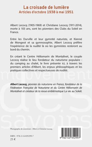 Albert Lecocq (1905-1969) et Christiane Lecocq (1911-2014), morte à 103 ans, sont les pionniers des Clubs du Soleil en France. Entre les Durville et leur gymnite naturiste, et Kienné de Mongeot et sa gymnosophie, Albert Lecocq préfère l'expérience de la nudité là où les gymnistes resteront au bord du chemin. En créant le Centre Héliomarin de Montalivet, le couple Lecocq réalise le lieu fondateur du naturisme populaire: du camping au chalet, le livre présente ici, à travers les premiers articles d'Albert, les enjeux philosophiques et les pratiques collectives et respectueuses de nudité.