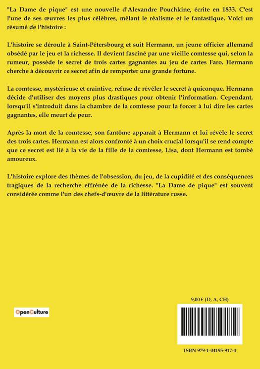 L'histoire explore des thèmes de l'obsession, du jeu, de la cupidité et des conséquences tragiques de la recherche effrénée de la richesse. "La Dame de pique" est souvent considérée comme l'un des chefs-d'oeuvre de la littérature russe.