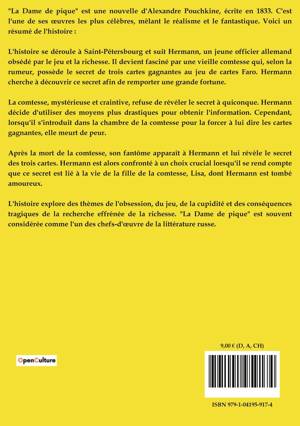 "La Dame de pique" est une nouvelle d'Alexandre Pouchkine, écrite en 1833. C'est l'une de ses oeuvres les plus célèbres, mêlant le réalisme et le fantastique. Voici un résumé de l'histoire :