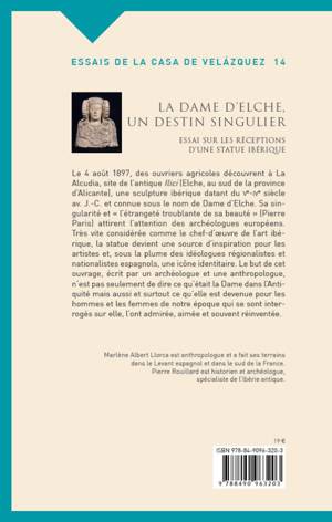 Le 4 août 1897, des ouvriers agricoles découvrent par hasard à La Alcudia, site de l'antique Ilici (Elche, au sud de la province d'Alicante), une sculpture ibérique datant du Ve-IVe siècle av. J.-C. et connue sous le nom de Dame d'Elche. Sa singularité et l'étrangeté troublante de sa beauté (Pierre Paris) conduisent les archéologues et les historiens de l'art à y voir le chef-d'oeuvre de l'art ibérique. Source d'inspiration pour les artistes, la Dame devient aussi, sous la plume des idéologues régionalistes et nationalistes espagnols, une icône identitaire. Cet ouvrage, écrit conjointement par un archéologue et une anthropologue, présente ces différents regards et les réactions esthétiques et affectives qui les accompagnent, tout en s'arrêtant sur les usages sociaux et politiques de la statue.