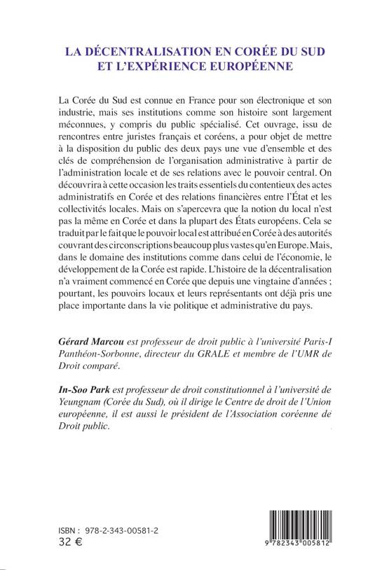 La Corée du Sud est connue en France pour son électronique et son industrie, mais ses institutions comme son histoire sont largement méconnues. Cet ouvrage, issu de rencontres entre juristes français et coréens, a pour objet de mettre à disposition une vue d'ensemble et des clés de compréhension de l'organisation administrative à partir de l'administration locale et de ses relations avec le pouvoir central.