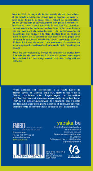 Pour le bébé, la magie de la découverte de soi, des autres et du monde environnant passe par la bouche, la main, le petit doigt, le pied, la peau, l’oeil... Autant de découvertes qui se conjuguent progressivement aux plans sensoriel et émotionnel dans la réciprocité de la relation. L’exploration sensorimotrice du bébé se décline dans ce texte au travers de six moments d’émerveillement : de la découverte du colostrum, qui permet à l’enfant d’entrer tout en douceur dans la force de la pesanteur, aux siestes avec papa pour soutenir la rencontre sensorielle avec l’entourage affectif. L’objectif ici est de relater ces moments d’ouverture au monde qui vont constituer les fondements de la construction de soi.<br /><br /><br /><br /> Pour les professionnels, il s’agit de soutenir la surprise face à la subtilité de la rencontre à l’autre, en prenant en compte la complexité à l’oeuvre, également dans des configurations difficiles.<br /><br /><br /><br /> Ce petit recueil se veut le témoin de la magie de la découverte de soi, des autres et du monde environnant. Six moments d’émerveillement nous permettent l’accès au monde du nouveau-né et du nourrisson et soutiennent l’effort de décentration que ce mouvement réclame:<br /><br /><br /><br /> 1. Quelques heures après la naissance : Texture et saveur du colostrum comme un passage tout en douceur pour arriver dans la pesanteur et avaler cette expérience.<br /><br /><br /><br /> 2. Entre 6 à 12 semaines: Extase autour de la découverte visuelle d’une main qui bouge comme une révélation renouvelée de ce qui fait le dedans et le dehors.<br /><br /><br /><br /> 3. Entre 3 et 6 mois: Découverte du petit doigt et de sa place dansl’espace: le nourrisson frotte sa main sur le sol.<br /><br /><br /><br /> 4. Entre 4 et 8 mois, c’est toute l’exploration orale qui débute et qui va faire le lit de la compréhension multisensorielle du monde. La bouche fonctionne alors comme un oeil pour découvrir le monde dans toute sa précision.<br /><br /><br /><br /> 5. Dès 6 mois, le bébé prend son pied et construit son dos par la même occasion. En amenant ses pieds à la bouche, bébé s’appuie sur son dos qui s’allonge et prend fonction de point d’appui.<br /><br /><br /><br /> 6. Une sieste avec papa, c’est l’opportunité de le sentir, de le découvrir, de faire sa connaissance, en faire une source d’apaisement et de sécurité.<br /><br /><br /><br /> Ce programme moteur, ce répertoire de base permet la rencontre à l’autre soutenue par la gestualité du nouveau-né et par les réponses qu’il obtient de la part de son entourage. Chacun des moments précieux à saisir s’appuie sur des exemples issus de la pratique pour en faire ressortir à la fois la complexité mais aussi la malléabilité. Pour les professionnels, il s’agit de soutenir l’émerveillement face à toute la subtilité de la rencontre à l’autre.