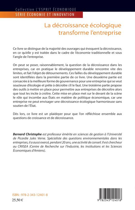 Ce livre identifie les failles du développement durable appliqué à l'entreprise. Il identifie ensuite la meilleure forme de gouvernance pour une entreprise qui se veut soucieuse d'écologie et prête à décroître s'il le faut. Il propose enfin des outils à mettre en place pour permettre aux entreprises de décroître, et revient sur le rôle qui incombe aux Etats en matière de politique économique, car une entreprise ne peut envisager une décroissance écologique harmonieuse sans soutien de l'Etat.