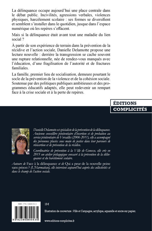 Une lecture du phénomène délinquant comme rupture du lien social. L'auteure montre que derrière la transgression se trouvent souvent des défaillances éducatives, un affaiblissement de l'autorité et des fractures familiales. Elle explique que la famille, premier lieu de socialisation, est le socle de la prévention, à condition d'être soutenue par des politiques publiques adaptées.