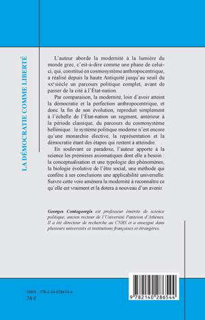 L'auteur aborde la modernité à la lumière du monde grec, c'est-à-dire comme une phase de celui-ci, qui, constitué en cosmosystème anthropocentrique, a réalisé depuis la haute Antiquité jusqu'au seuil du xxe siècle un parcours politique complet, avant de passer de la cité à l'État-nation. Par comparaison, la modernité, loin d'avoir atteint la démocratie et la perfection anthropocentrique, et donc la fin de son évolution, reproduit simplement à l'échelle de l'État-nation un segment, antérieur à la période classique, du parcours du cosmosystème hellénique : le système politique moderne n'est encore qu'une monarchie élective, la représentation et la démocratie étant des étapes qui restent à atteindre. En soulevant ce paradoxe, l'auteur apporte à la science les prémisses axiomatiques dont elle a besoin : la conceptualisation et une typologie des phénomènes, la biologie évolutive de l'être social, une méthode qui confère à ses conclusions une applicabilité universelle. Suivre cette voie amènera la modernité à reconnaître ce qu'elle est vraiment et la dotera à nouveau d'un avenir.