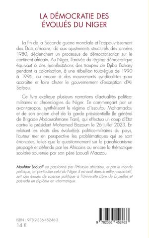 La fin de la Seconde guerre mondiale et l'appauvrissement des états africains, dû aux ajustements structurels des années 1980, déclenchent un processus de démocratisation sur le continent africain. Au Niger, l'arrivée du régime démocratique équivaut à des manifestations des troupes de Djibo Bakary pendant la colonisation, à une rébellion touarègue de 1990 à 1996, ou encore à des mouvements syndicalistes pour accroître et faire chuter le gouvernement d'exception d'Ali Saibou. Ce livre explique plusieurs narrations d'actualités politico-militaires et chronologies du Niger. En commençant par un avant-propos, synthétisant le régime d'Issoufou Mahamadou et de son ancien chef de la garde présidentielle (le général de Brigade Abdourahmane Tiani), qui effectua un coup d'État contre le président Mohamed Bazoum le 26 juillet 2023. En relatant les récits des évolué(e)s politico-militaires du pays, l'auteur met en perspective les problématiques qui se sont énoncées, telles que le questionnement sur le panafricanisme propagé et défendu par les Africains ou encore la thématique scolaire soutenue par son père Laouali Maazou.