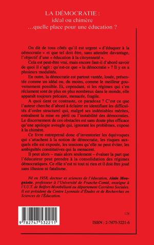 On dit de tous côtés qu'il est urgent " d'éduquer à la démocratie " et que tel doit être, sans attendre davantage, l'objectif d'une " éducation à la citoyenneté ". Cela est peut-être vrai, mais encore faut-il d'abord savoir de quoi il s'agit : qu'est-ce que " la démocratie " ? Il y en a plusieurs modalités. En outre, la démocratie est partout vantée, louée, présentée comme un idéal ou, du moins, comme le meilleur gouvernement possible. Et, cependant, si les régimes qui s'en réclament sont de plus en plus nombreux dans le monde, elle apparaît toujours précaire, menacée, fragile. A quoi tient ce contraste, ce paradoxe ? C'est ce que l'auteur cherche d'abord à éclairer en identifiant les difficultés d'ordre structurel qui, malgré ses indéniables mérites, entraînent la mise en péril ou l'instabilité des démocraties. Le discernement de ces obstacles est sans doute plus efficace qu'une apologie aveugle qui, ignorant les problèmes, expose à la chimère. Ce livre entreprend donc d'inventorier les équivoques qui s'attachent à la notion de démocratie, les risques auxquels elle est exposée, les tensions qu'elle ne peut éviter, les ambiguïtés constitutives qui la menacent. Il peut alors - mais alors seulement - évaluer la part que l'éducateur peut prendre à la consolidation des régimes démocratiques. Ce rôle n'est ni tout ni rien et il doit être joué sans illusion ni fatalisme.