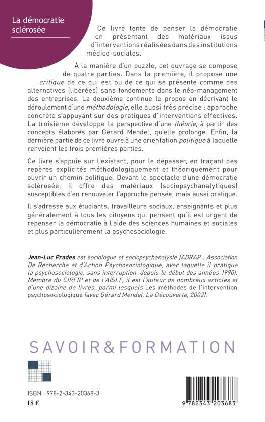 Ce livre tente de penser la démocratie en présentant des matériaux issus d'interventions réalisées dans des institutions médico-sociales. Devant le spectacle d'une démocratie sclérosée, il offre des matériaux (sociopsychanalytiques) susceptibles d'en renouveler l'approche pensée, mais aussi pratique.Il s'adresse aux étudiants, travailleurs sociaux, enseignants et plus généralement à tous les citoyens qui pensent qu'il est urgent de repenser la démocratie à l'aide des sciences humaines et sociales et plus particulièrement la psychosociologie.