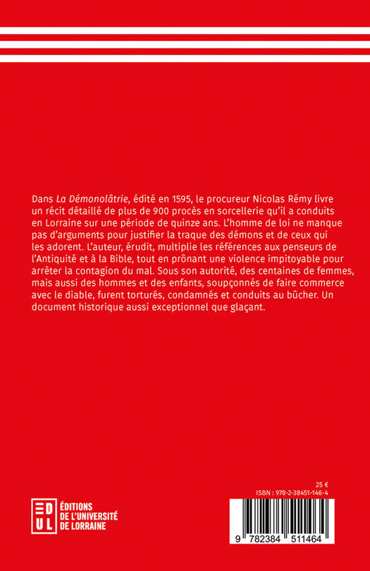 Dans La Démonolâtrie, édité en 1595, le procureur Nicolas Rémy livre un récit détaillé de plus de 900 procès en sorcellerie qu’il a conduits en Lorraine sur une période de quinze ans. L’homme de loi ne manque pas d’arguments pour justifier la traque des démons et ceux qui les adorent. L’auteur, érudit, multiplie les références aux penseurs de l'Antiquité et à la Bible, tout en prônant une violence impitoyable pour arrêter la contagion du mal. Sous son autorité, des centaines de femmes, mais aussi des hommes et des enfants, soupçonnés de faire commerce avec le diable, furent torturés, condamnés et conduits au bûcher. Un document historique aussi exceptionnel que glaçant.