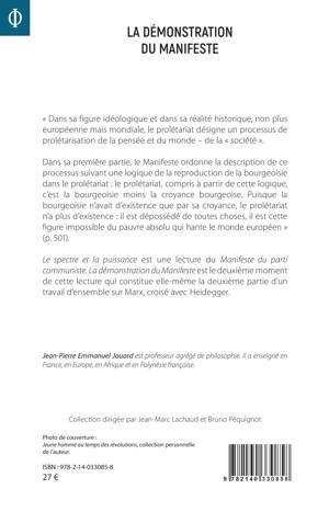 « Dans sa figure idéologique et dans sa réalité historique, non plus européenne mais mondiale, le prolétariat désigne un processus de prolétarisation de la pensée et du monde de la « société ». Dans sa première partie, le Manifeste ordonne la description de ce processus suivant une logique de la reproduction de la bourgeoisie dans le prolétariat : le prolétariat, compris à partir de cette logique, c'est la bourgeoisie moins la croyance bourgeoise. Puisque la bourgeoisie n'avait d'existence que par sa croyance, le prolétariat n'a plus d'existence : il est dépossédé de toutes choses, il est cette figure impossible du pauvre absolu qui hante le monde européen » (p. 501). Le spectre et la puissance est une lecture du Manifeste du parti communiste. La démonstration du Manifeste est le deuxième moment de cette lecture qui constitue elle-même la deuxième partie d'un travail d'ensemble sur Marx, croisé avec Heidegger.