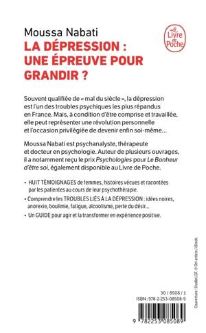 Contrairement aux idées reçues, la dépression, loin de constituer une maladie à éradiquer, représente une crise maturante, l’occasion privilégiée de guérir son enfant intérieur. À condition d’être accueillie et travaillée, elle aide la personne à faire le deuil de son passé, à devenir enfin elle-même, celle qu’elle a toujours été mais n’a jamais osé être, par peur de déranger, de déplaire. Moussa Nabati nous montre que toutes ces souffrances renvoient à une culpabilité imaginaire, ancienne et inconsciente, liée à l’enfance. À travers huit témoignages de femmes, il expose et développe les symptômes de la dépression, leur origine et leur signification et nous permet de nous familiariser avec les grands concepts de la psychanalyse moderne.