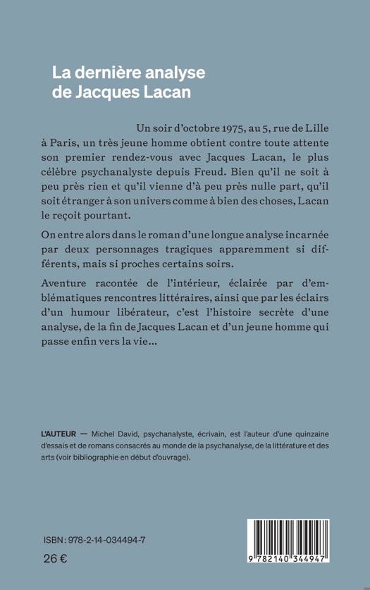 Un soir d'octobre 1975, au 5, rue de Lille à Paris, un très jeune homme obtient contre toute attente son premier rendez-vous avec Jacques Lacan, le plus célèbre psychanalyste depuis Freud. Bien qu'il ne soit à peu près rien et qu'il vienne d'à peu près nulle part, qu'il soit étranger à son univers comme à bien des choses, Lacan le reçoit pourtant. On entre alors dans le roman d'une longue analyse incarnée par deux personnages tragiques apparemment si différents, mais si proches certains soirs. Aventure racontée de l'intérieur, éclairée par d'emblématiques rencontres littéraires, ainsi que par les éclairs d'un humour libérateur, c'est l'histoire secrète d'une analyse, de la fin de Jacques Lacan et d'un jeune homme qui passe enfin vers la vie