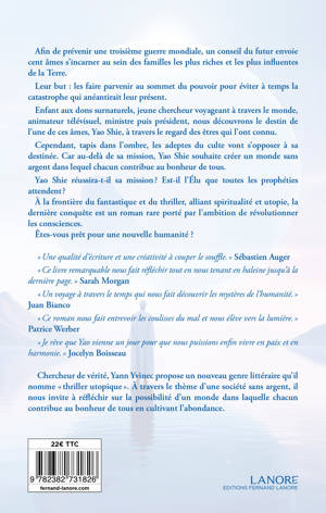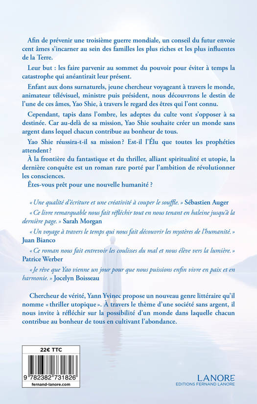 Afin de prévenir une troisième guerre mondiale, un conseil du futur envoie cent âmes s’incarner au sein des familles les plus riches et les plus influentes de la Terre. Leur but : les faire parvenir au sommet du pouvoir afin d’éviter à temps la catastrophe qui anéantirait leur présent. Enfant psychique, adolescent déjouant un coup d’État, jeune chercheur voyageant à travers le monde à la découverte de la spiritualité des peuples premiers, animateur télévisuel, ministre puis président, nous accompagnons le destin de l’une de ces âmes, Yao, à travers le regard des êtres qui l’ont connu. Cependant, tapis dans l’ombre, les adeptes d’un culte sataniste veulent s’opposer à sa destinée. Car au-delà de sa mission, Yao souhaite créer un monde sans argent dans lequel chacun contribue au bonheur de tous. Yao Shie réussira-t-il sa mission ? Est-il enfin l’Élu que toutes les prophéties attendent ? À la frontière de l'anticipation, du fantastique et du thriller, alliant spiritualité et utopie, la dernière conquête est un roman rare porté par l’ambition de révolutionner les consciences.