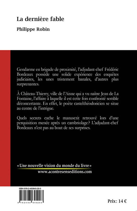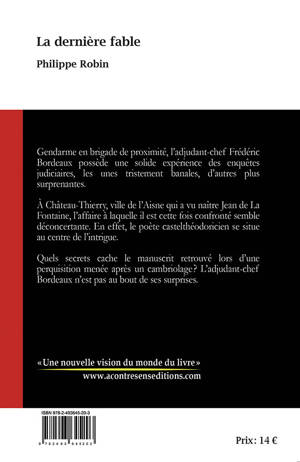 Argumentaire Ce sont l’ambiance et le mystère qui nous séduisent dans cet ouvrage. Au travers d’une enquête atypique puisqu’elle nous entraîne sur les traces des écrits de Jean de La Fontaine – et c’est là toute la particularité du livre – on entre dans l’univers de la gendarmerie et de ses enquêtes locales ou pas. Rien de surjoué chez nos personnages, rien qui sonne faux, les pages de ce roman nous laissent l’impression d’y être, de pénétrer dans les bureaux, de partager les réflexions des militaires de la gendarmerie, autour d’une enquête pas si évidente à résoudre… Résumé Gendarme en brigade de proximité, l’adjudant-chef Frédéric Bordeaux possède une solide expérience des enquêtes judiciaires, les unes tristement banales, d’autres plus surprenantes. À Château-Thierry, ville de l’Aisne qui a vu naître Jean de La Fontaine, l’affaire à laquelle il est cette fois confronté semble déconcertante. En effet, le poète castelthéodoricien se situe au centre de l’intrigue. Quels secrets cache le manuscrit retrouvé lors d’une perquisition menée après un cambriolage ? L’adjudant-chef Bordeaux n’est pas au bout de ses surprises.