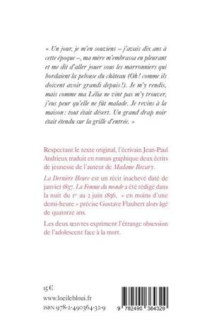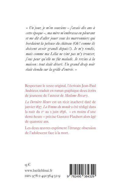 L’écrivain Jean-Paul Andrieux transforme en roman graphique deux Åuvres de jeunesse de Gustave Flaubert : La dernière heure (1837) et La femme du monde (1836). Deux écrits qui expriment expriment l’étrange obsession de l’adolescent face à la mort.