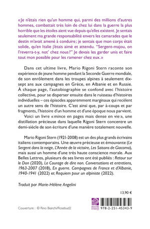 Dans cet ultime livre, Mario Rigoni Stern raconte son expérience de jeune homme pendant la Seconde Guerre mondiale, de son enrôlement dans les troupes alpines à seulement dix-sept ans aux campagnes en Grèce, en Albanie et en Russie. À chaque page, l’autobiographie se confond avec l’histoire collective, pour se disperser ensuite dans le ruisseau d’histoires individuelles – ces épisodes apparemment marginaux qui recèlent un autre sens de l’histoire. C’est ainsi que, par à-coups et par fragments, l’histoire d’un homme et d’une époque nous parvient.
